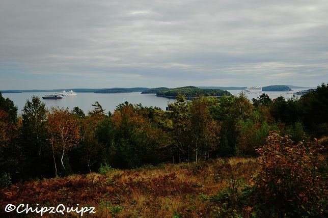 Three cruise ships in Bar Harbor. The two to the left are a fraction of the size of the one on the right!